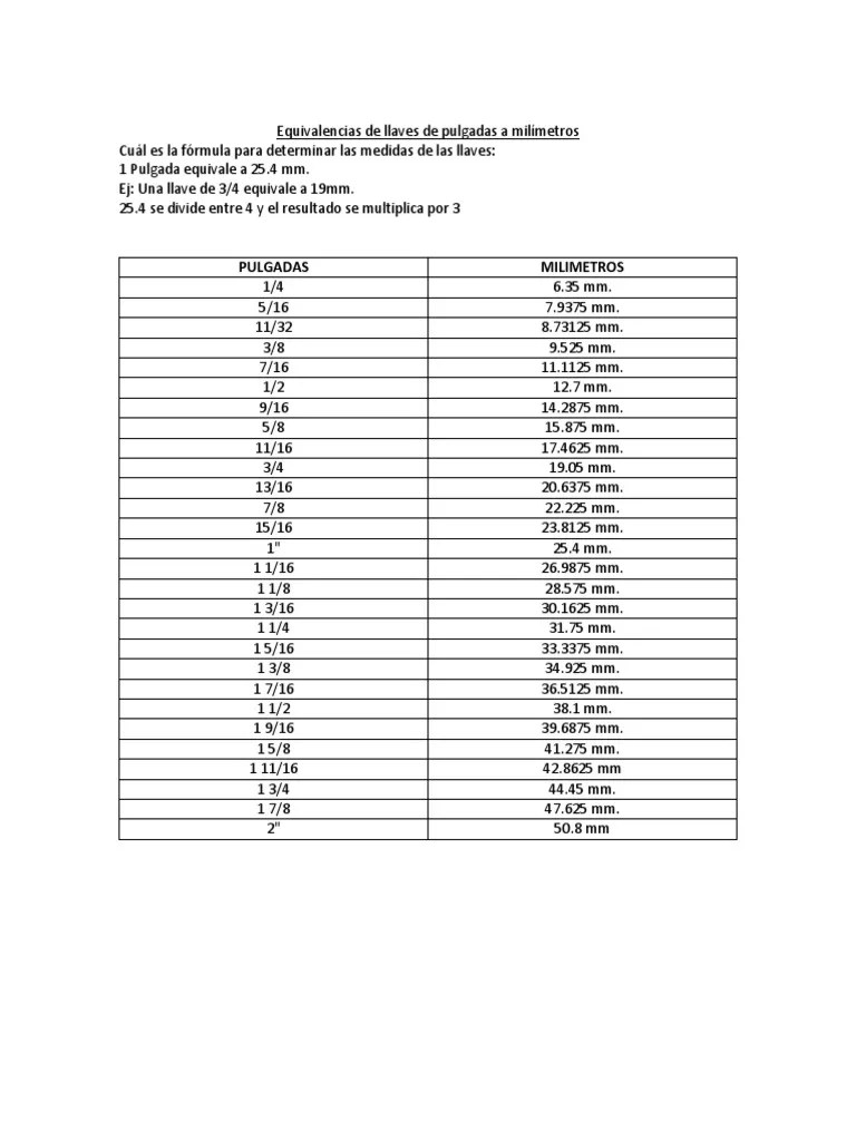 3/8, 6/16, 9/24, 12/32, 15/40 ; 3/8, 9.525, 0.375, 1 3/8, 34.925, 1.375, 2 3/8, 60.325, 2.375. Existen conversores de medidas y pesos en internet que ayudan a conseguir la equivalencia correcta.